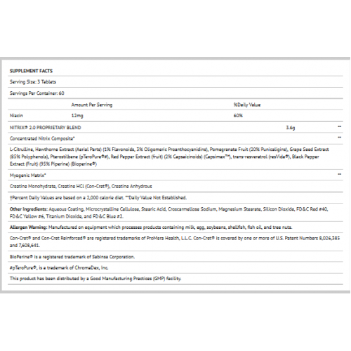 By supporting these key areas of workout performance, NITRIX® 2.0 provides a valuable foundation for all your supplementation and training efforts. And NITRIX® 2.0 is more convenient than ever. Ideally users will take 3 tablets 60 minutes prior to training and 3 tablets post-workout with CELLMASS® 2.0, keeping the tablet count down to only 6 per day.