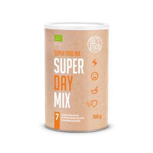 Bio Super Day Mix is a 100% natural and organic product. All its ingredients possess an ecological certificate. It is an excellent source of B-vitamins, iron, selenium, folic acid, beta-carotene and many others. Guarnina, a main ingredient of guarana, stimulates the body and mind more effective than coffee. Maca boosts libido, Acai Berries deliver an array of vitamins and antioxidants. Spirulina strenghtens the body, Whaetgrass and Cacao boost the energy level.