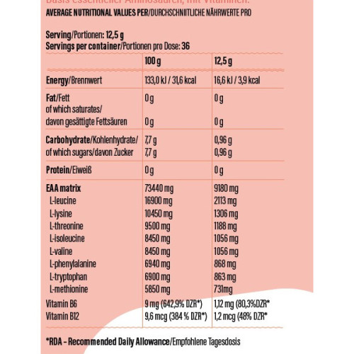 EAA matrix (L-leucine, L-lysine, L-threonine, L-isoleucine, L-valine, L-phenylalanine, L-tryptophan, L-methionine), acidulants (citric acid, malic acid), isomaltulose (palatinose).
