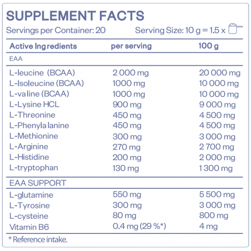 Place one serving (approximately 1.5 scoops) of EAA COMPLEX in 200 mL of water and mix thoroughly until powder is completely dissolved. Drink before and/or during exercise. EAA COMPLEX is stimulant-free and can be combined with pre-workout supplements. For maximal benefits, consume an additional surviving immediately after exercising. On non-training days, consume up to two servings, between meals.