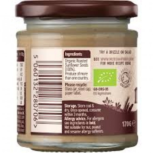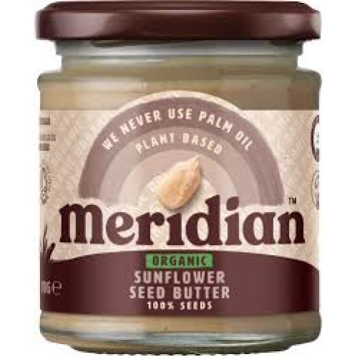 Meridian Foods Organic Sunflower Seed Butter 170g is made using 100% sunflower seeds that are roasted and then ground until smooth. Try spreading on crackers and crumpets, adding to tray bakes, home-made loaves or dressings. Meridian Foods seed butters contain no added sugar or salt and are suitable for vegans. Meridian Foods don't use palm oil in any of our products because they care about the environmental impact it can have. Oil separation is natural and can be simply stirred back in.
