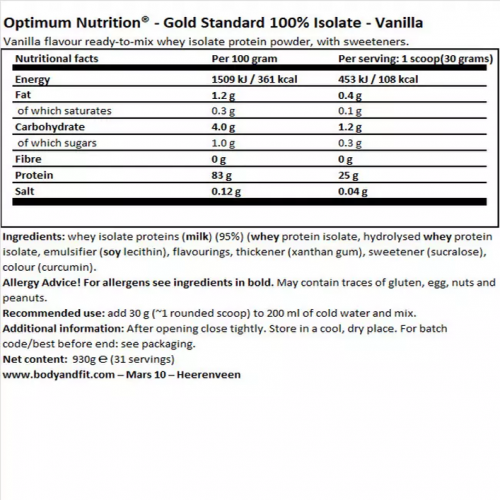 Optimum Nutrition > Gold Standard 100% Isolate Whey 930g Vanilla