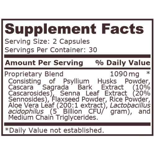 1090 mg* Consisting of Psyllium Husks Powder, Cascara Sagrada Bark Extract (10% Cascarosides), Senna leaf Extract (20% Sennosides), Flaxseed Powder, Rice Powder, Aloe Vera Leaf(200:1 extract), Lactobacillus acidophilus (5 billion CFU/gram), and Medium Chain Triglycerides.