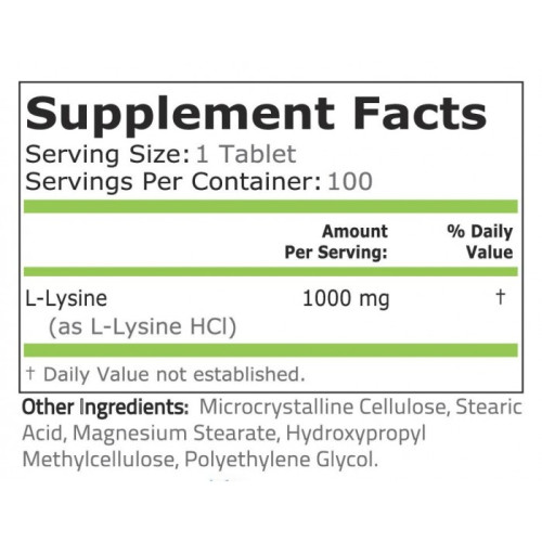 Pure Nutrition L-lysine is made in a cGMP facility in the USA. It is also free of gluten, soy, milk, egg, tree nuts, artificial colors, and GMOs. Each serving of Pure Nutrition L-Lysine contains a research-based dose of 1000 mg in the form of L-lysine HCl to ensure maximal bioavailability and absorption by your body.