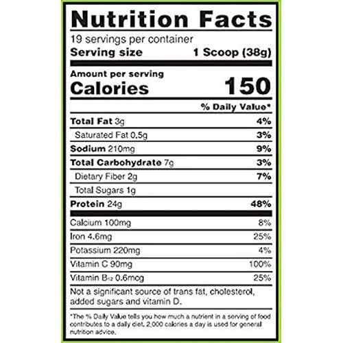 Plant Protein Blend (Organic Pea Protein, Organic Brown Rice Protein, Organic Sacha Inchi Protein), Organic Cocoa Powder (Processed with Alkali), Natural Flavor, Organic Natural Flavor, Organic Stevia Leaf Extract, Ancient Trim Organic Grain Blend (Organic Amaranth, Organic Quinoa, Organic Buckwheat, Organic Millet, Organic Chia), Organic Guar Gum, Xanthan Gum, Ascorbic Acid, Organic Gum Arabic, Salt, Organic Pomegranate Powder, Cyanocobalamin.