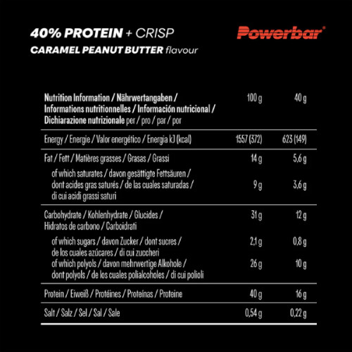 enty of exercise and a varied, healthy diet are important. At the same time, a protein-rich diet contributes to the growth and maintenance of muscle mass. The Powerbar® 40% PROTEIN + CRISP skilfully combines crunchy elements with a soft layer and is also low in sugars. This makes it the ideal reward after active exercise.