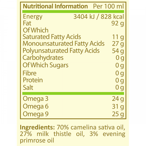 Omega Oil Active is an omega-3-6-9 essential fatty acid (EFA) supplement designed specifically for active individuals who want to take their performance and vitality to the next level. Using unrefined, cold-pressed Camelina sativa oil, milk thistle oil, and evening primrose oil, Omega Oil Active provides a balanced blend of omega-3, omega-6, and omega-9 EFAs that are necessary for optimal physical and mental performance. Unlike many fish oil and omega supplements, Omega Oil Active has a neutral flavor and can be added seamlessly to foods and recipes. Try adding Omega Oil Active to your favorite salads for a healthy fat boost! Alternatively, you can take Omega Oil Active with a spoon and glass of water.