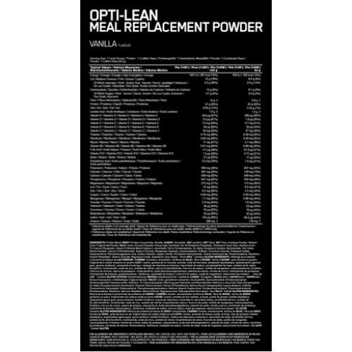 OPTI-LEAN Meal Replacement shake from Optimum Nutrition helps reduce bodyweight. It provides fast and slowly digesting proteins in a powdered meal replacement product that mixes easily, tastes great and contains 7.3 grams* of fibre and with high quality carb sources from oats, flaxseed & chickpeas. Available in three tasty flavours; chocolate, strawberry & vanilla.